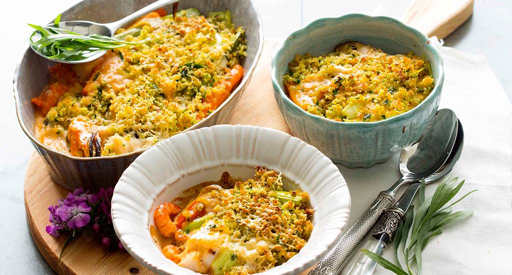 - Corte o pão em pedaços para dentro do robot de cozinha, junte um punhado de salsa, os dentes de alho e o queijo parmesão. Pique tudo, adicione três colheres de sopa de Vaqueiro Líquida e ligue o robot na função pulse até a Vaqueiro estar bem incorporada. Deite o molho preparado sobre a mistura de peixe e marisco, por cima disponha os legumes e cubra com a mistura de pão ralado. Leve ao forno durante cerca de 15 minutos ou até a superfície estar dourada.