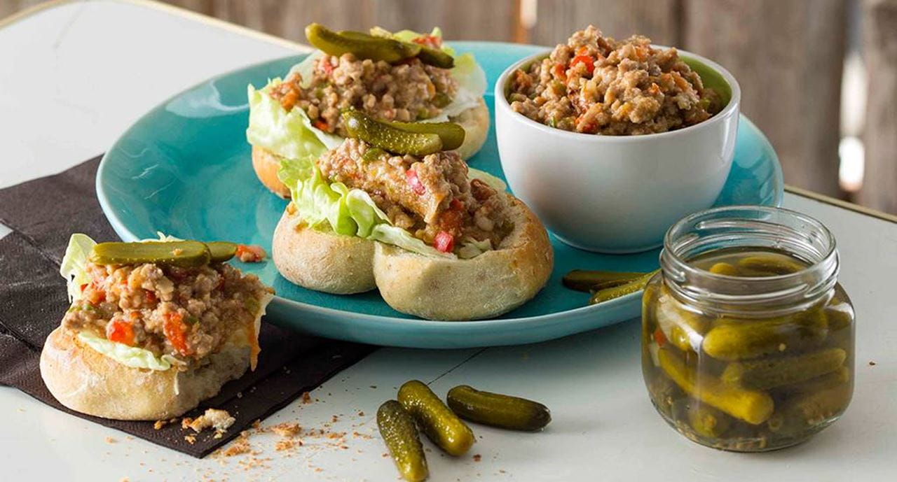 - Retire do lume e junte o milho escorrido. Corte uma tampa aos pães, retire o miolo e forre-os com as folhas de alface. Por cima distribua a mistura de carne, enfeite com os pepinos de conserva cortados em rodelas finas e cubra com a tampa do pão.