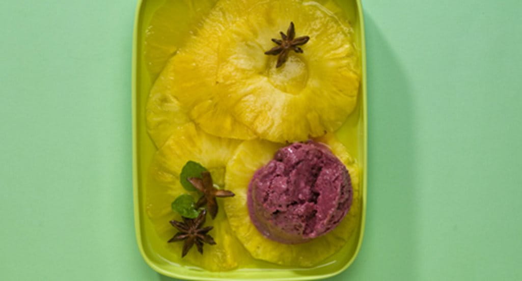 Iogurte gelado de frutos silvestres com carpaccio de abacaxi