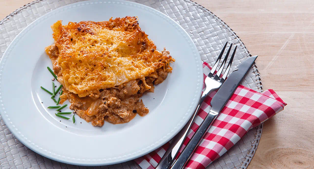 - 3. Num tabuleiro de louça disponha em camadas o cozinhado de carne e as placas de lasanha, começando e terminando com o preparado de carne.