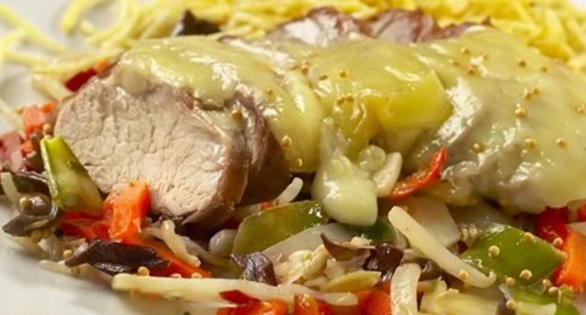 Lombinho de porco suado com queijo da Serra e sementes de mostarda