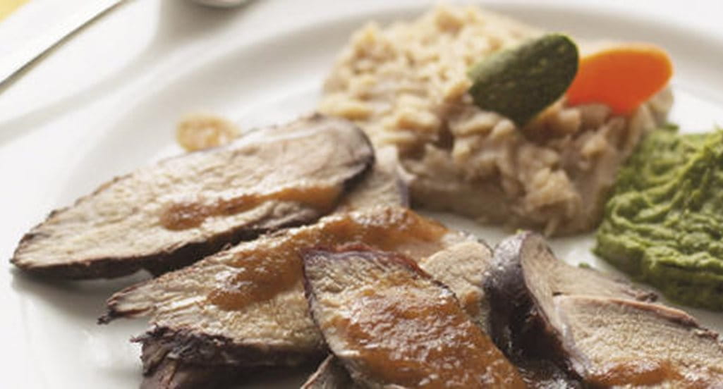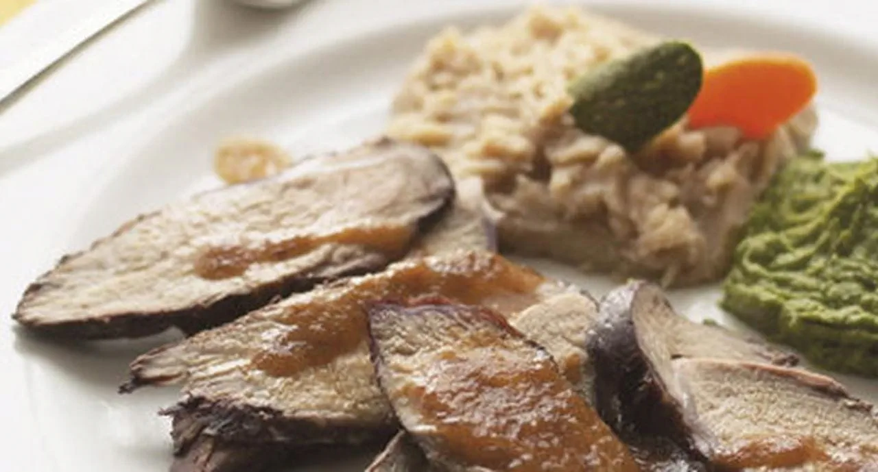 - Corte a carne em fatias muito finas, que devem estar cor-de-rosa por dentro, e disponha-as numa travessa. Sirva-as com o puré de frutos.