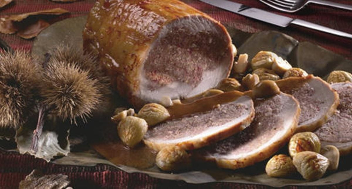 - Corte o bacon em bocados e pique-o na picadora ou no robot de cozinha. Faça o mesmo a metade das castanhas, cozidas e descascadas. Tire a pele às salsichas frescas e misture a carne com o bacon e as castanhas, picados. Junte as gemas e tempere com sal, pimenta e noz moscada. Espalhe o recheio sobre a carne, una de novo as duas partes e cosa o lado aberto com agulha e linha. Coloque o lombo recheado num tabuleiro, por cima espalhe a metade daVaqueiro Líquidae regue com o cubo de caldo de carne, dissolvido na água quente. Leve a assar em forno moderado (200 °C) durante cerca de 1 hora e 45 minutos, regando de vez em quando com o molho.