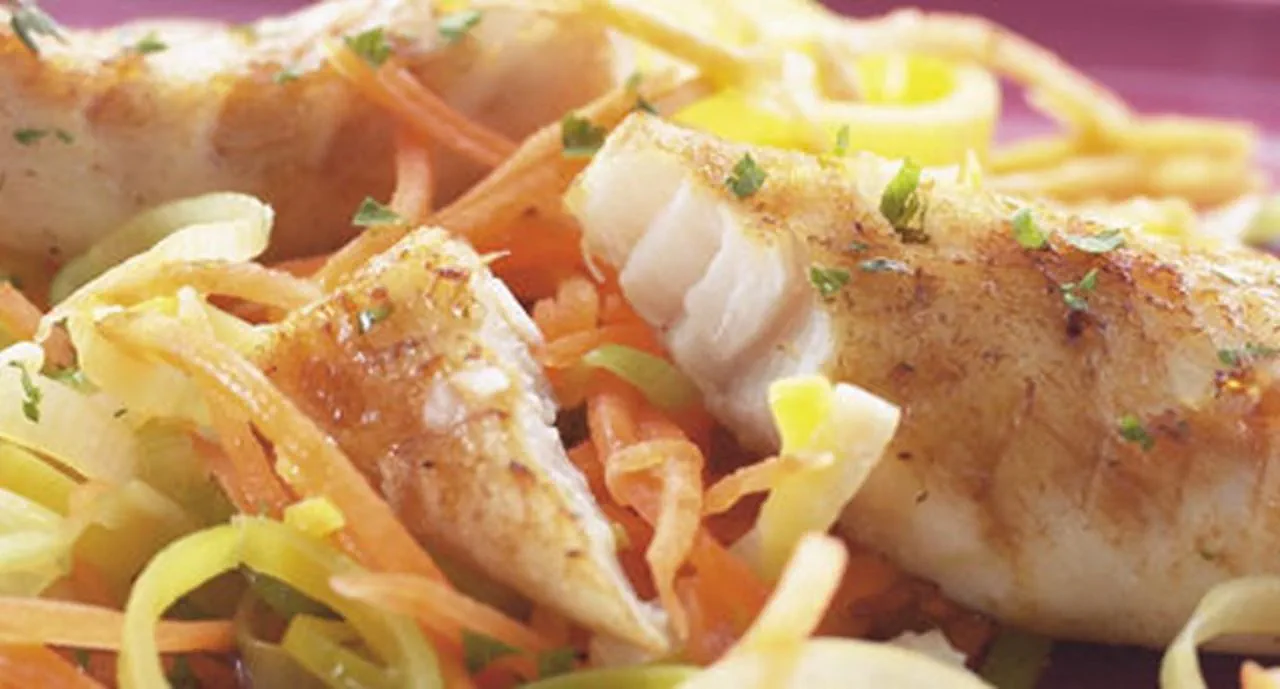 2. Coloque aVaqueiro Líquidanuma frigideira e aloure aí o peixe escorrido. Entretanto corte o alho francês em rodelas e rale as cenouras. Retire o peixe da frigideira, introduza os legumes e deixe saltear até estarem moles. Regue com o vinho onde marinou o peixe e introduza de novo os medalhões. Deixe apurar um pouco.