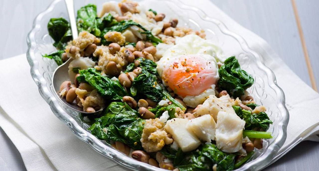 Lombos de pescada com migas de nabiças e feijão-frade