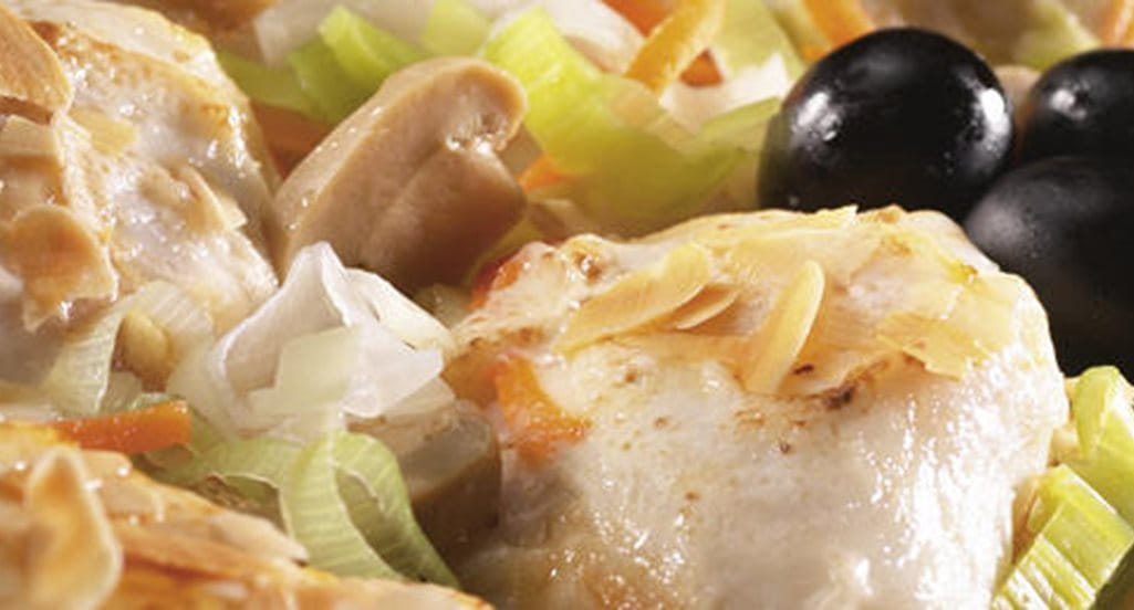 - Corte o alho francês em fatias finas e lave-o muito bem juntamente com a juliana de lombarda e cenoura. Escorra e leve a estufar sobre lume brando com aVaqueiro Líquida. Quando os legumes estiverem moles junte os cogumelos bem escorridos e deixe apurar sobre lume forte com o tacho destapado, durante cerca de 10 minutos. Tempere com sal e pimenta e introduza o peixe. Tape o tacho, reduza o calor e deixe cozinhar cerca de 10 minutos. Disponha o puré de batata, em coroa, num tabuleiro fundo que possa ir ao forno e à mesa. No centro coloque cuidadosamente os legumes estufados e os medalhões de pescada e barre-os com maionese. Polvilhe com as lâminas de amêndoa e leve a gratinar em forno quente.
