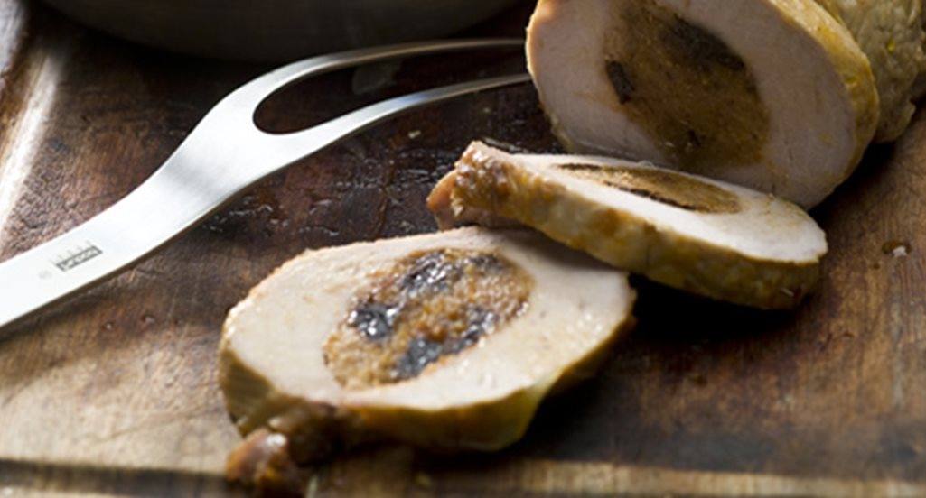 - Entretanto, pique as ameixas e adicione-as à alheira. Misture bem e coloque a mistura sobre a carne. Molde o recheio em rolo e disponha-o a todo o comprimento no centro da carne. Dobre as abas da carne sobre o recheio de modo a que este fique no centro, e ate com fio de cozinha. Derreta a restante Vaqueiro na mesma frigideira, introduza a carne e aloure-a de todos os lados.