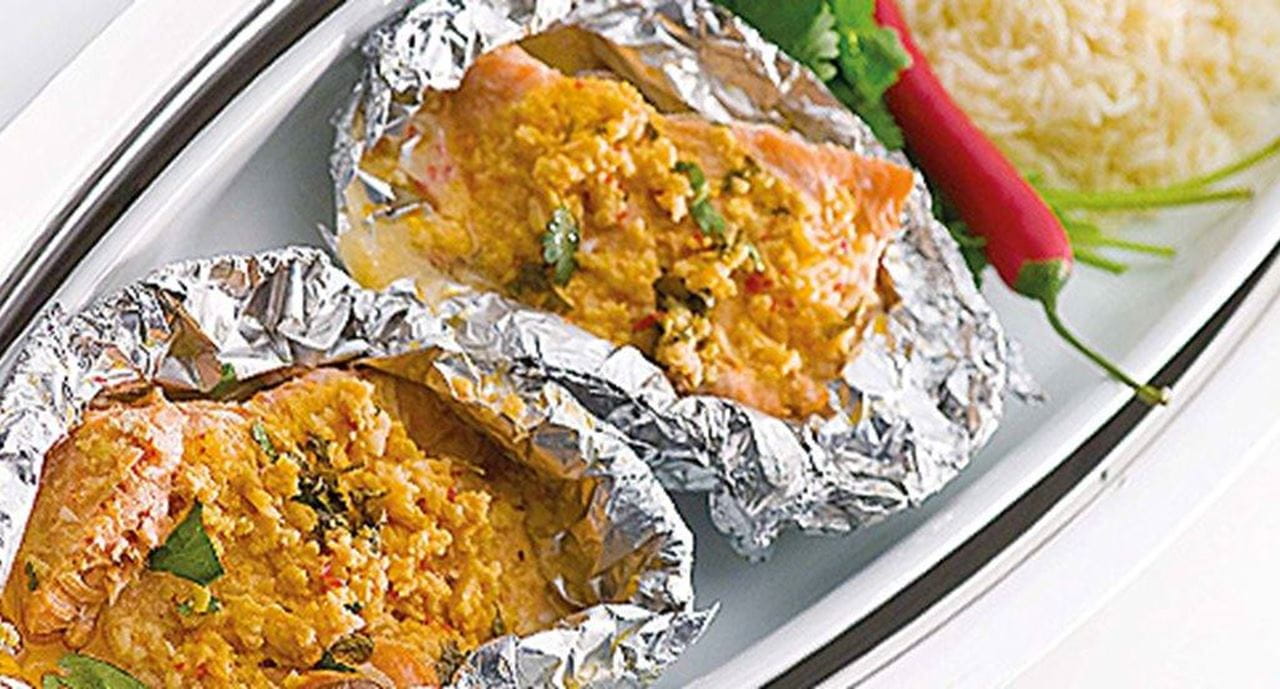 Lombos de salmão com côco e coentros