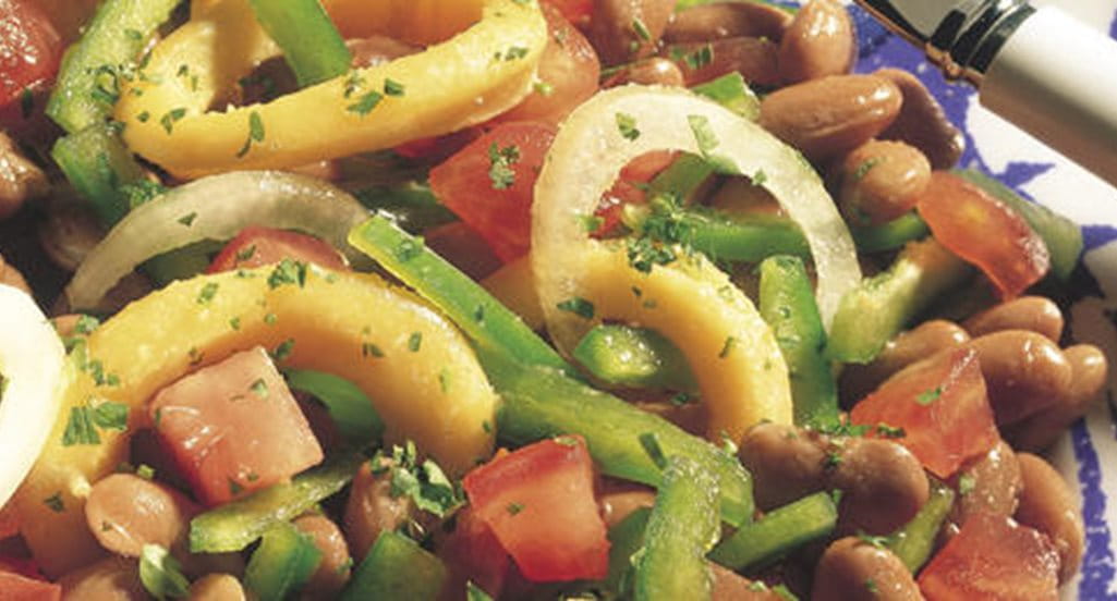 - Pele e corte o tomate em cubinhos, retire as sementes ao pimento e corte-o em tirinhas. Escorra o conteúdo da lata de feijão para um coador, passe por água fria e deixe escorrer. Deite numa saladeira e junte o tomate, o pimento, a restante cebola e as argolas de lulas. Misture o sumo de limão com o óleo Vaqueiro e tempere com piripiri e sal. Deite sobre a salada e mexa cuidadosamente. Sirva bem fresca, polvilhada com salsa picada