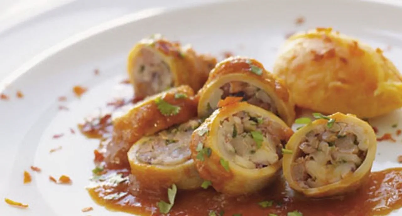 Lulas recheadas em tomatada com puré de batata e cenoura