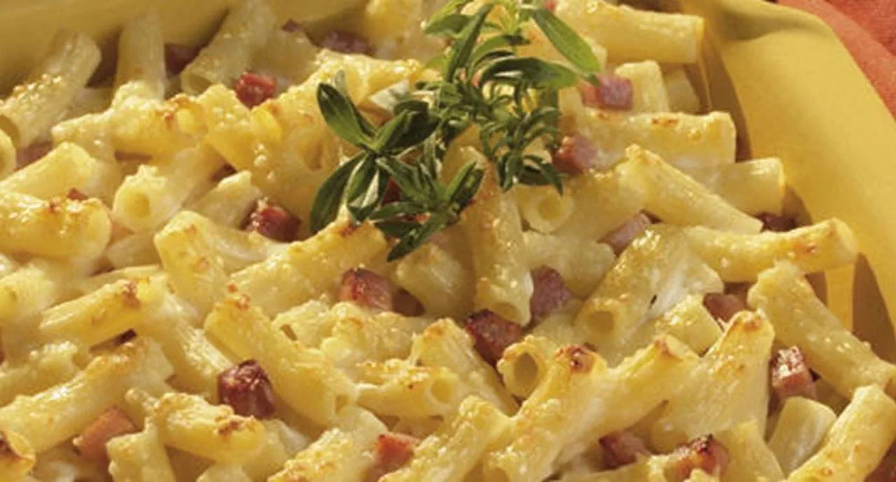 - Coza o macarrão em água temperada com sal e um fio de óleo. Quando estiver al dente, escorra, misture com o fiambre cortado em cubinhos e coloque num tabuleiro que possa ir ao forno e à mesa.
