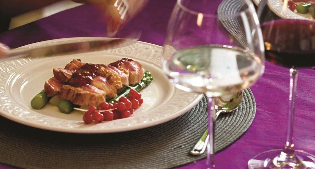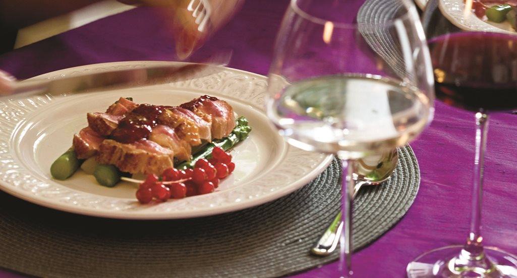 Magret grelhado sobre cama de espargos e emulsão de frutos silvestres