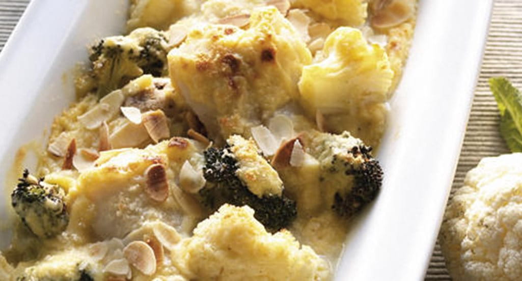 - Coloque os medalhões de pescada no centro de um tabuleiro de forno que possa ir à mesa, previamente untado com margarina Vaqueiro. À volta disponha alternadamente os brócolos e a couve flor e cubra tudo com o molho preparado. Polvilhe com o queijo ralado e introduza no forno quente (220°C). Passados 20 minutos, polvilhe com as amêndoas em fatias e deixe no forno durante mais 10 minutos ou até a superfície estar dourada.
