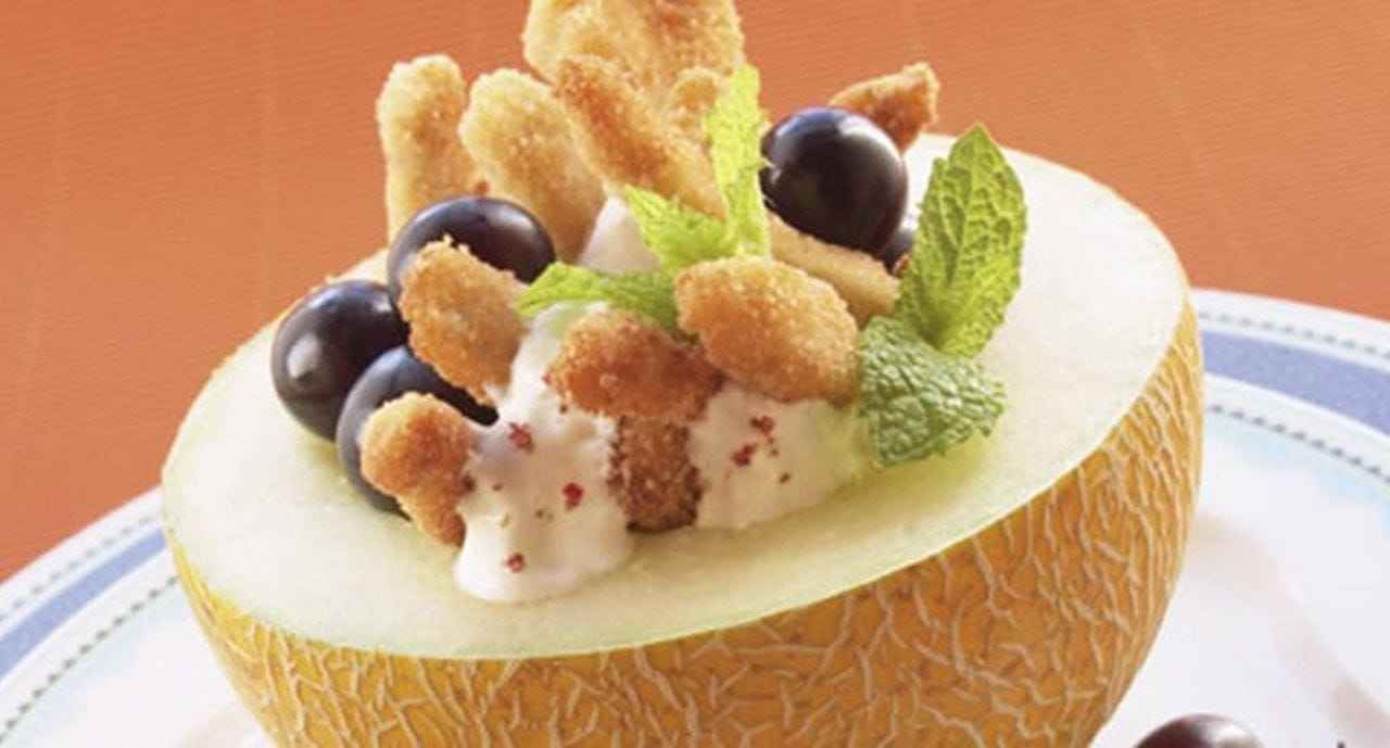 - Corte as meloas ao meio, retire as pevides e recheie com os bagos de uvas pretas, previamente lavados e as tirinhas de frango fritas.