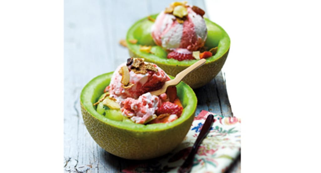 - Divida a mistura pelas meias cascas de meloa e sirva com uma bola de gelado Carte d’Or de iogurte com morangos.