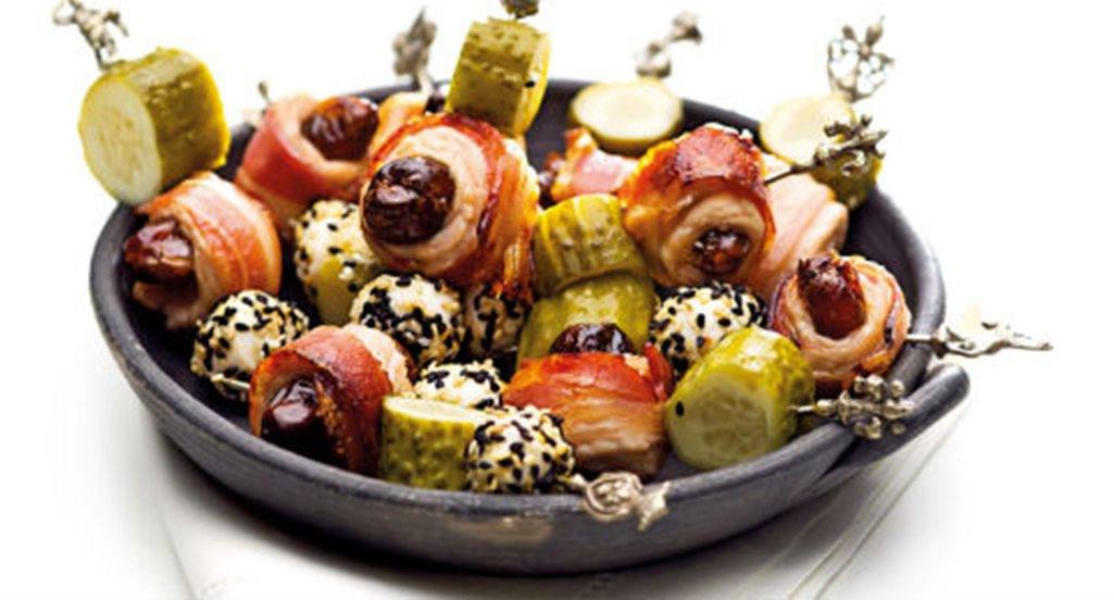 - Enfie os rolinhos de carne em espetos pequenos alternadamente com as rodelas de pepino de conserva e os mini mozzarellas.