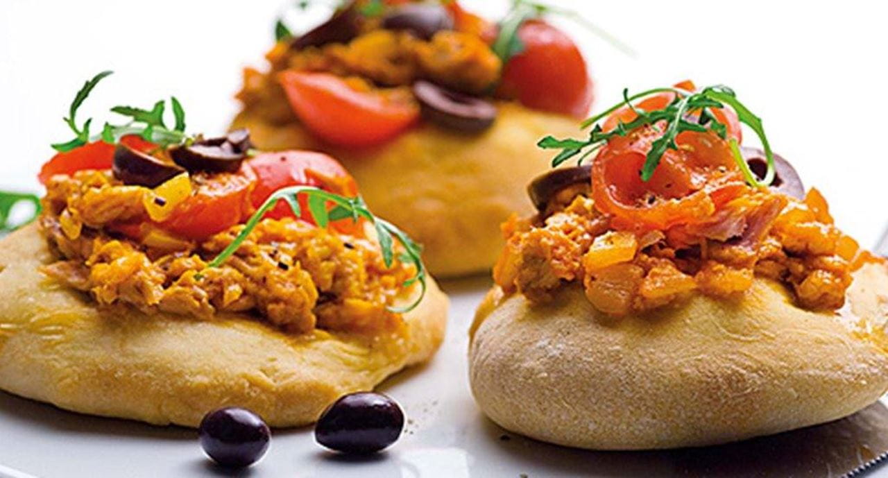 - Espalhe o preparado sobre as mini foccaccias e salpique com as rodelas de azeitona e folhas de rúcula.