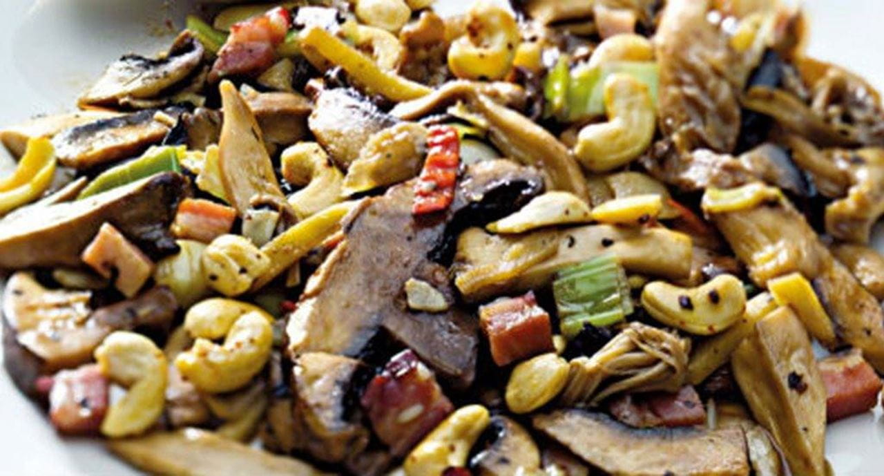 - Deite os cogumelos e o gengibre na frigideira, aumente um pouco o calor e salteie mexendo até os cogumelos estarem tenros. Adicione o molho de ostra e o mel, mexa e tempere com sal, se achar necessário. Salpique com o caju.