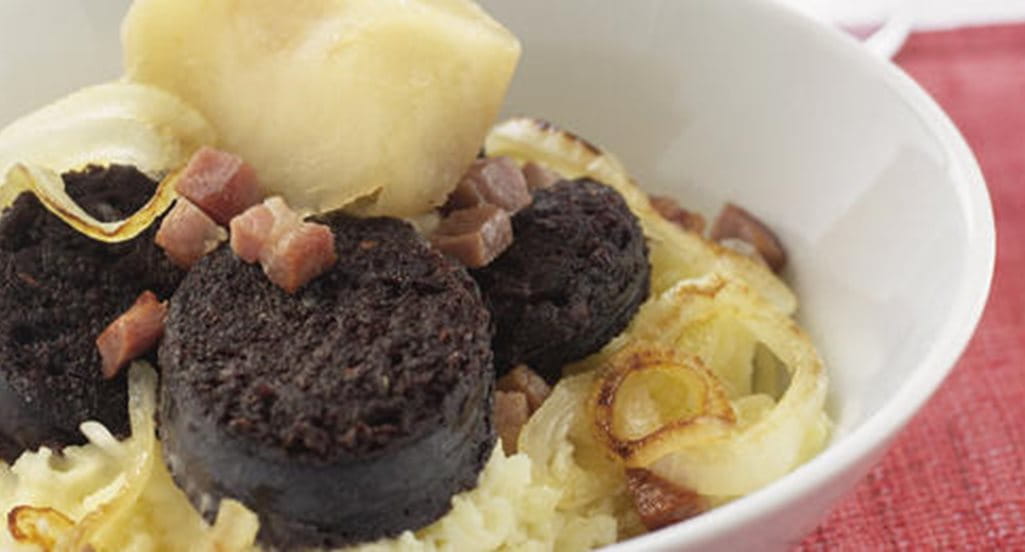 - Leve o bacon ao lume numa frigideira e deixe alourar enquanto corta a morcela em rodelas com cerca de um dedo de espessura. Empurre o bacon para um dos lados da frigideira e aloure as rodelas de morcela na gordura que o bacon largou. até estarem crocantes de ambos os lados. Retire o bacon e a morcela e reserve no forno junto da maçã e do puré. Deite na frigideira a s cebolas descascadas e cortadas em rodelas e deixe alourar bem. Se for necessário junte um pouco de Vaqueiro.