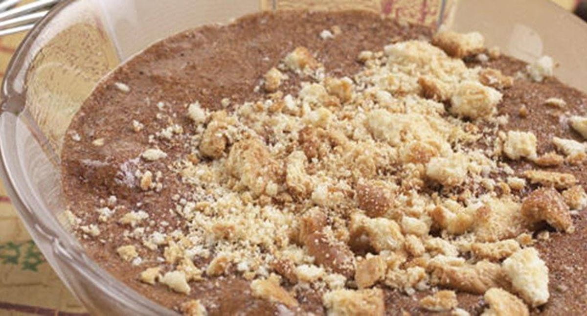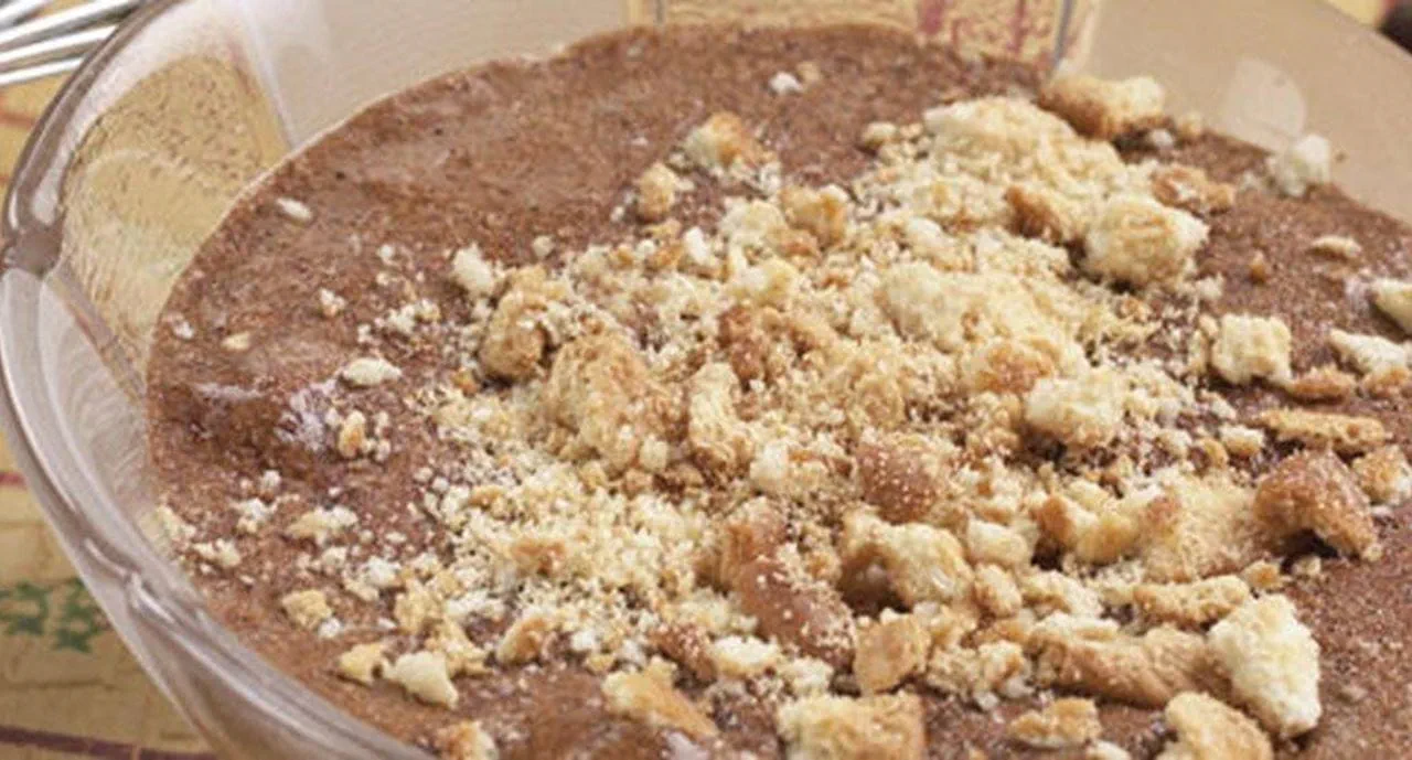 - Rale grosseiramente as bolachas e espalhe cerca de 1/3 sobre o fundo de uma taça. Por cima deite a mousse preparada, alternando em camadas com as restantes bolachas.