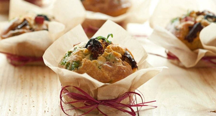 - Misture numa tigela a farinha, o fermento em pó, o bacon em cubos, as azeitonas cortadas em rodelas, os tomates secos cortados em pedaços pequenos, uma pitada de sal e um pouco de pimenta. Misture tudo. Adicione o leite e os ovos e misture mais uma vez.