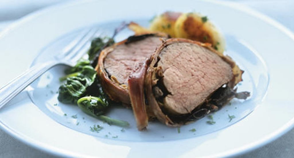 - Aqueça mais 50 g deVaqueiro Líquidae aloure a carne de todos os lados. Tempere com sal e pimenta moída na altura. Entretanto coloque as fatias de presunto sobre a bancada, ligeiramente sobrepostas e de modo a formarem um rectângulo. Por cima distribua os cogumelos, bem escorridos e espalmados. Por cima coloque a carne, enrole e ate com fio de cozinha como se fosse um paio e leve ao forno durante 15 minutos.Deite o caldo de legumes e o vinho do Porto à frigideira onde fritou a carne, mexa com uma espátula para dissolver os resíduos e adicione os dentes de alho, descascados e esborrachados. Leve a a ferver cerca de 10 minutos. Entretanto, escorra e pele as batatas e salteie-as noutra frigideira com mais 50 g deVaqueiro Líquida. Polvilhe com salsa picada e misture-as com os espinafres