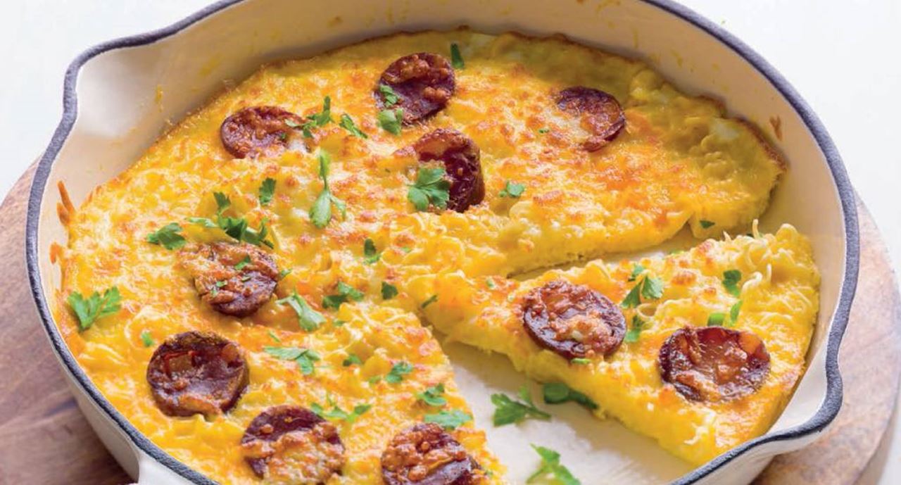 Omelete aberta com noodles, chouriço e queijo