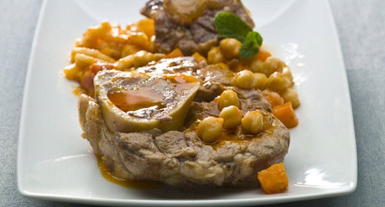 Osso buco estufado com legumes e grão