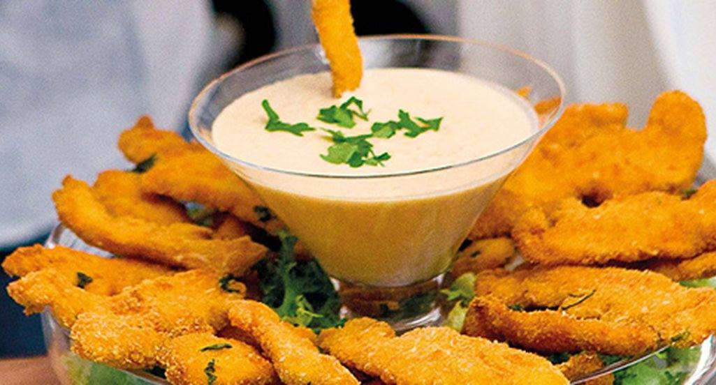 - Escorra bem as tiras de frango e passe-as primeiro pelo ovo batido e em seguida pela mistura de pão ralado. Frite no óleo quente e escorra sobre papel absorvente.