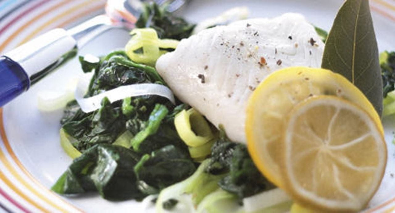 - Corte o limão e a lima em rodelas fininhas e leve a ferver com a água e as folhinhas de louro. Entretanto ponha as rodelas de alho francês num cesto para cozer a vapor. Introduza no tacho, tape e deixe cozinhar cerca de 5 minutos. Espalhe por cima do alho francês as folhas de espinafres e coza mais 5 minutos. Deite a mistura de espinafres e alho francês num passador de rede, esprema bem, espalhe sobre a travessa de serviço e salpique com o molho de soja. Reserve, mantendo quente. Tempere o peixe com uma pitada de sal, coloque-o no cesto de vapor e volte a introduzi-lo no tacho. Deixe cozinhar o peixe 5 a 10 minutos.