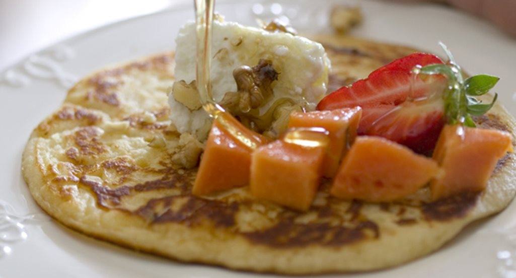 - 6. Sirva as panquecas com mel e fruta fresca, iogurte natural ou requeijão.