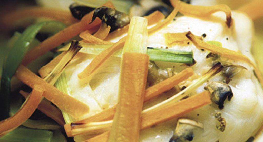 Papelotes de Pescada com Legumes da Estação e Gambas
