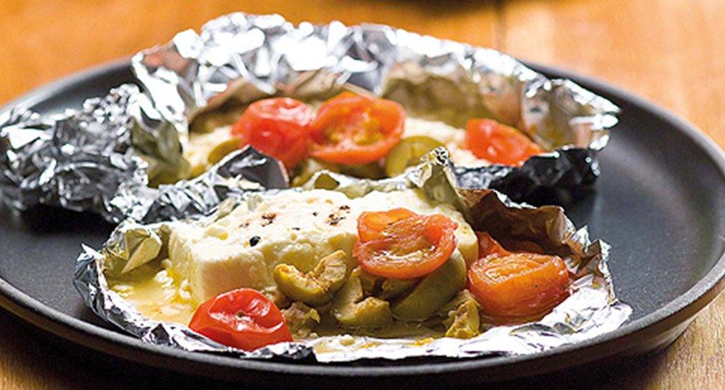 - Corte 4 quadrados de folha de alumínio e pincele com óleo. Por cima coloque as fatias de queijo feta e perfume com pimenta preta moída na altura.