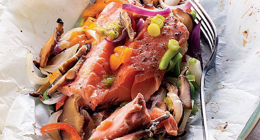 - Abra um rasgo a todo o comprimento nos lombos de salmão e coloque-os sobre os legumes.