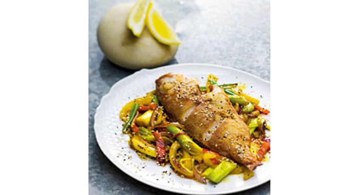 - Escorra sobre papel absorvente e depois mude para um recipiente fundo, cubra com os legumes preparados, salpique com sementes de sésamo e enfeite com o limão cortado em gomos ou em meias rodelas.