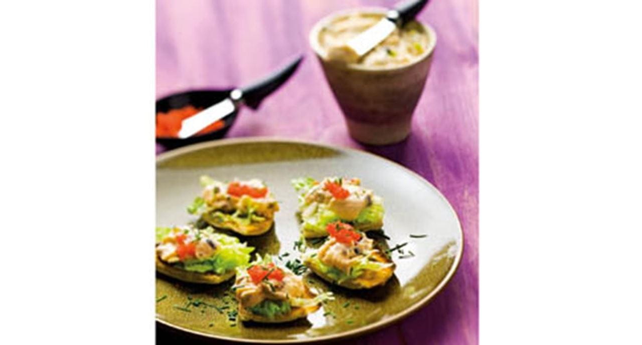 - Distribua a juliana de alface pelos triângulos de pão pita, por cima coloque a pasta de salmão e enfeite com as ovas de lumpo.