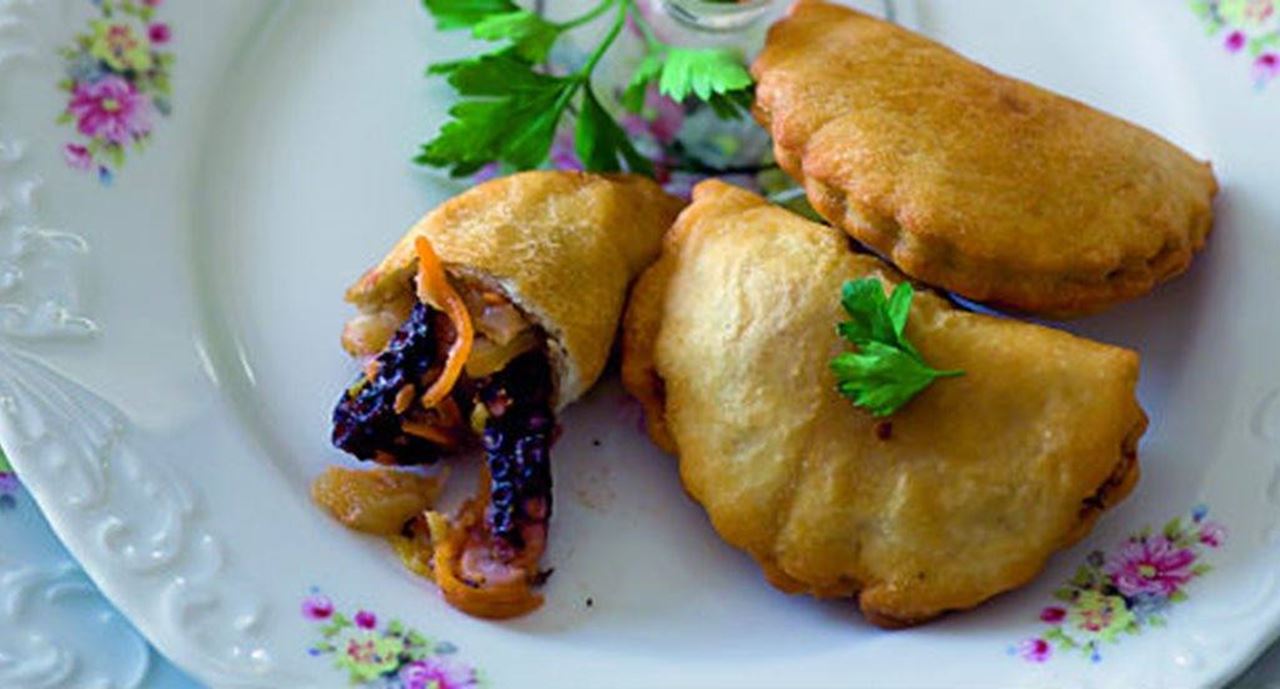 - Estenda pequenas porções de massa em circulo sobre a bancada de trabalho com ajuda de farinha e do rolo da massa. Coloque uma colherada de recheio sobre o centro a massa, dobre a massa pressionando os bordos para fazer aderir bem e repita até esgotar o recheio e a massa.
