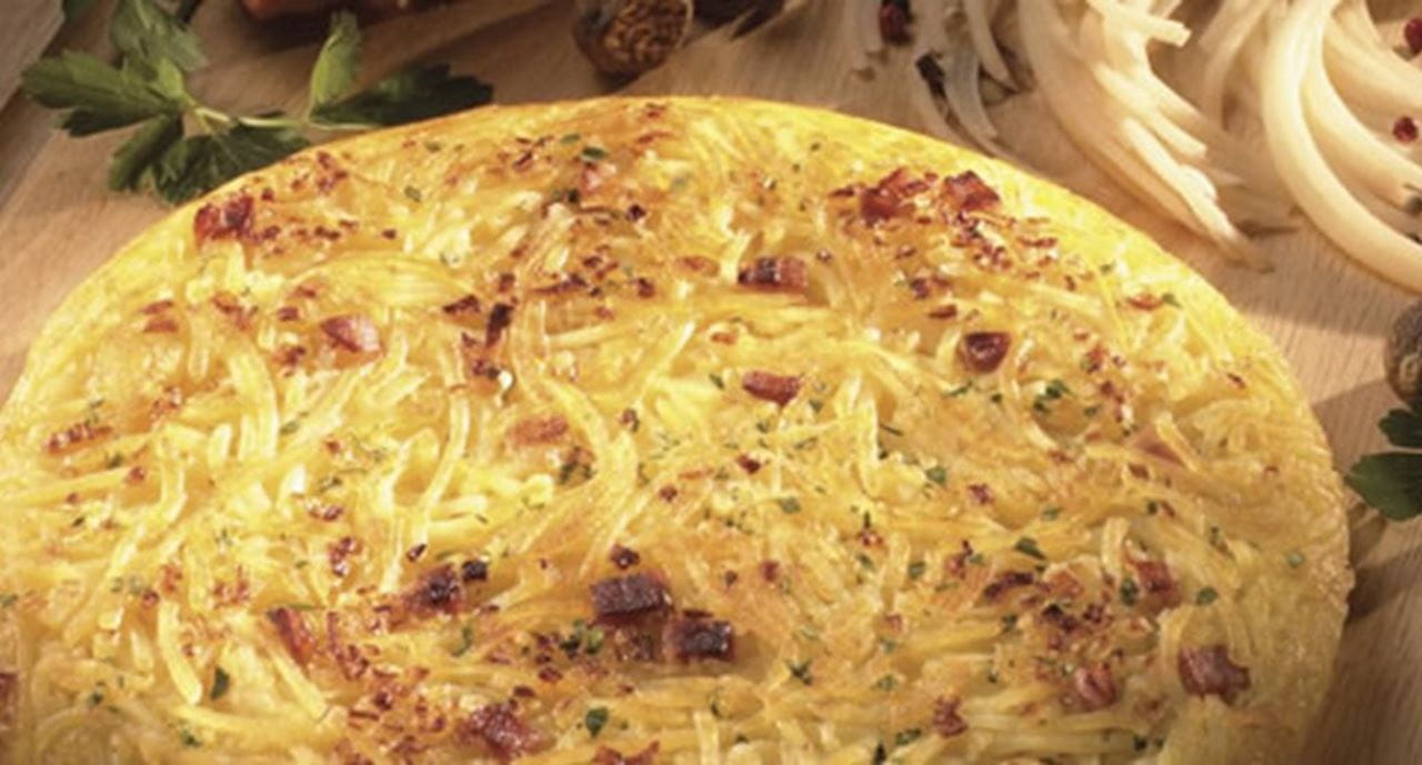 - Numa frigideira grande, deite a cebola finamente picada e aloure-a, com a Vaqueiro e o bacon cortado em cubinhos. Depois, junte as batatas raladas grosseiramente em fios. Tempere com sal, pimenta e noz moscada, moídas na ocasião e calque ligeiramente as batatas com uma escumadeira. Deixe cozinhar até as batatas estarem louras e compactas.