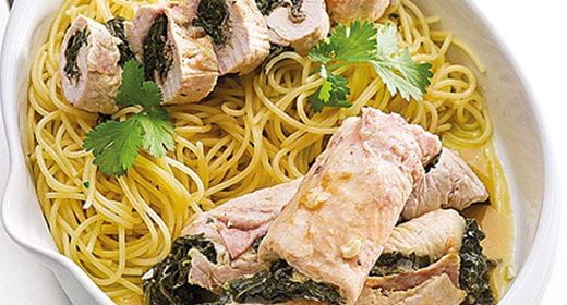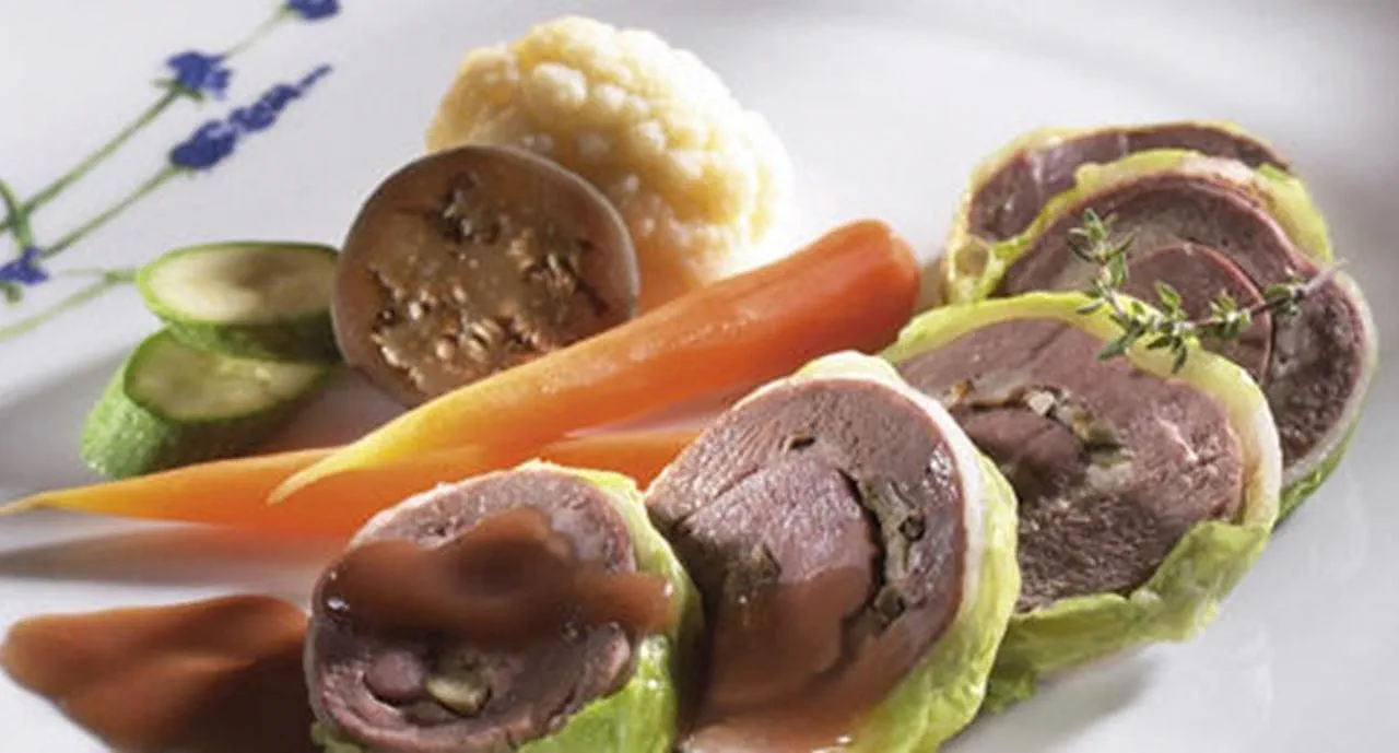 - Corte o véu de porco em 4 quadrados. Lave e apare os talos às folhas de couve lombarda e escalde-as em água a ferver durante 5 minutos. Barre os peitos de pato com a carne picada, por cima distribua os míscaros salteados e enrole como se fosse uma torta. Envolva cada rolinho num pedaço de véu de porco e seguidamente nas folhas de couve lombarda. Prenda com um palito se for necessário.