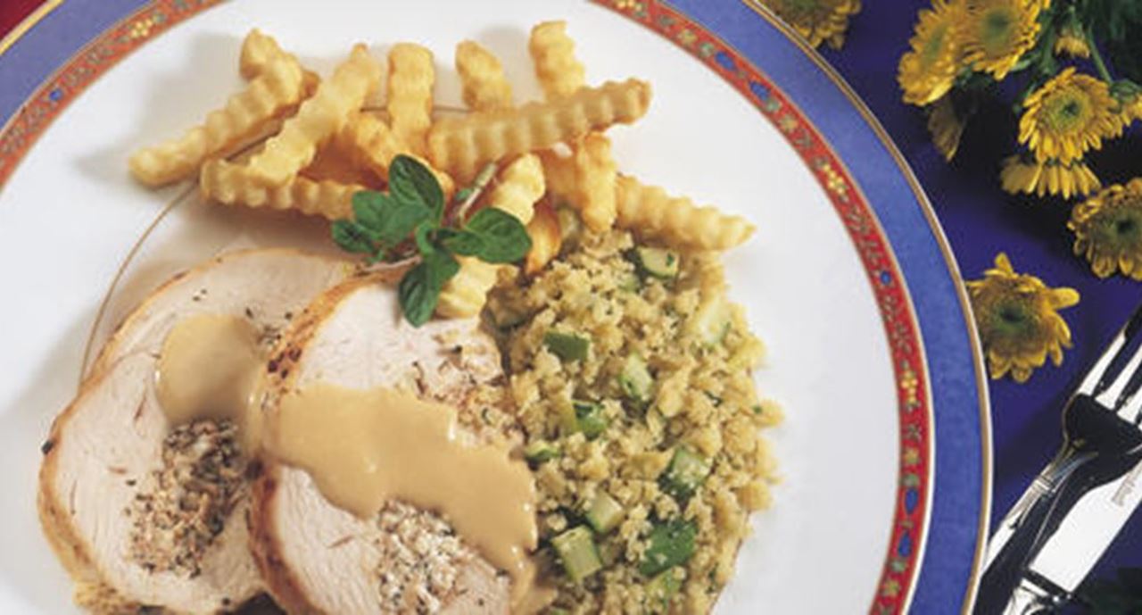 - Com uma faca afiada, abra uma bolsa no peito de peru. Pique os queijinhos frescos com a pasta de fígado, metade do estragão, sal e pimenta, até obter uma pasta.