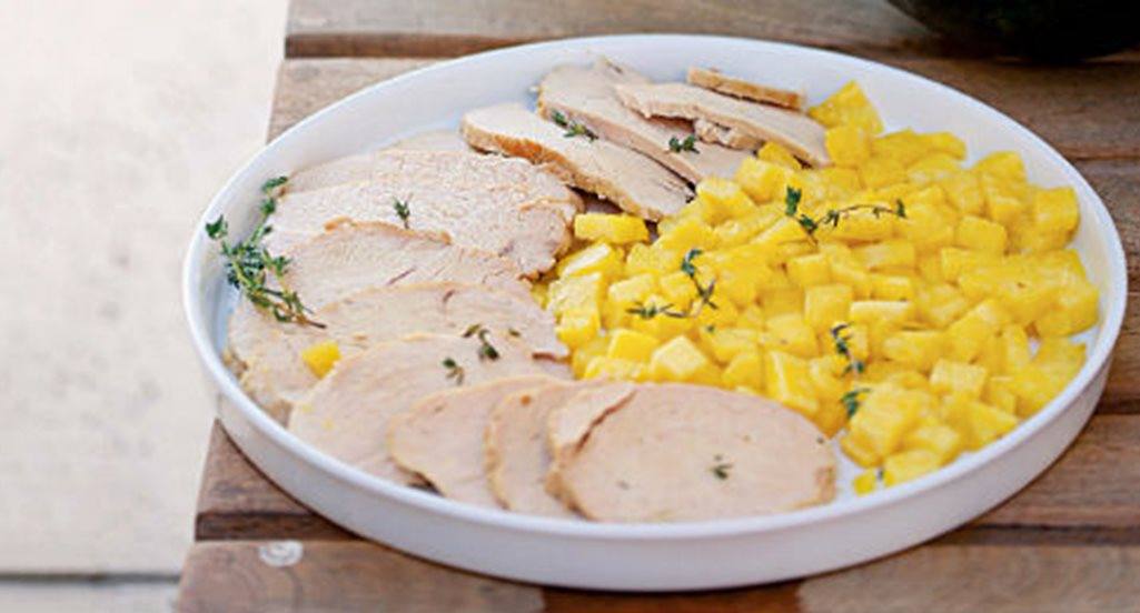 - Depois da carne estar fria, retire o cordel, corte-a em fatias e disponha-as sobre as rodelas de ananás.