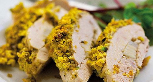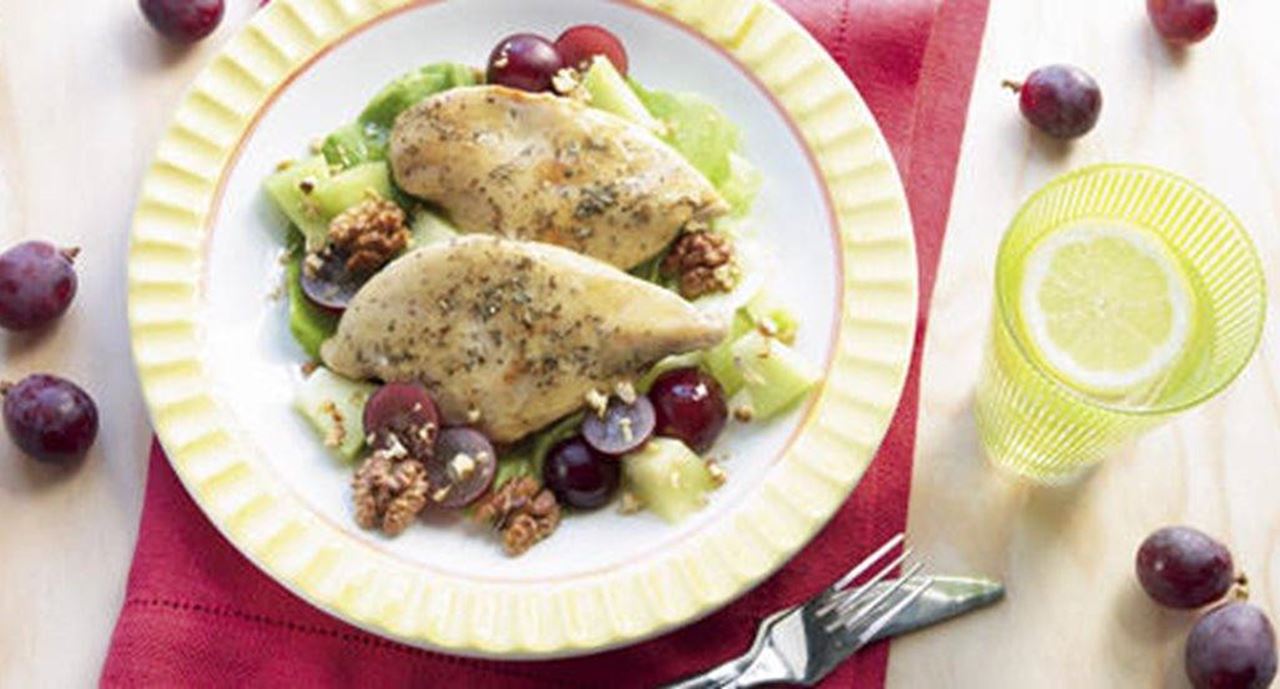 - Disponha os peitos de frango sobre folhas de alface bem lavadas. Junte as uvas lavadas e sem grainhas, as bolas ou cubos de meloa e regue com o molho. Polvilhe com as nozes tostadas e sirva.