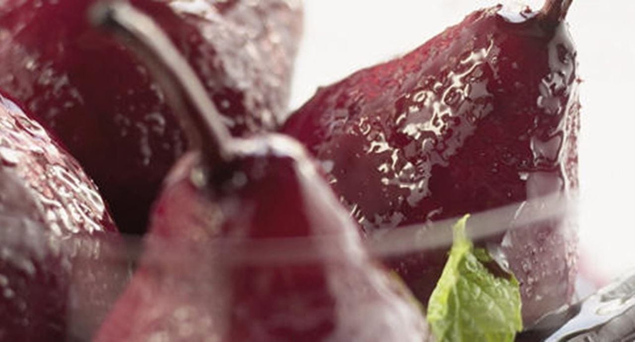- Descasque as peras deixando intacto o pé. Coloque-as num tacho e regue-as com o sumo de limão. Junte uma casca de limão, um pau de canela e o açúcar. Regue com o vinho tinto e o vinho Moscatel e leve a ferver sobre lume moderado até as pêras estarem macias. Retire-as cuidadosamente para o recipiente onde as vai servir e deixe arrefecer. Aumente o lume e ferva um pouco mais a calda onde cozeram até ficar com uma consistência xaroposa. Deite sobre as peras. Sirva decoradas com folhinhas de hortelã e pau de canela.
