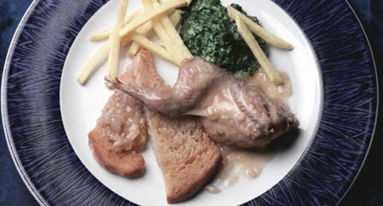 - Quando estiverem quase prontas frite as fatias de pão em azeite e prepare o acompanhamento que pode ser esparregado de nabiças ou espinafres e batatas fritas. Sirva as perdizes sobre as fatias de pão frito com o molho e acompanhe com esparregado e batatas fritas.