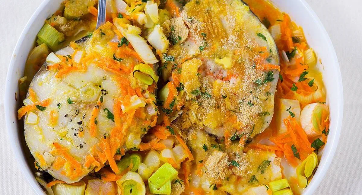 - Disponha as postas de pescada num tabuleiro de ir ao forno, previamente untado com Vaqueiro, e tempere-as com sal e pimenta. Por cima espalhe a mistura de legumes, adicione o vinho e polvilhe com o pão ralado.