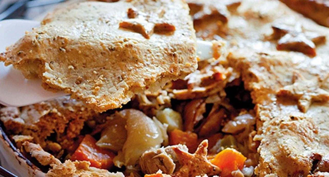 - Retire os legumes do tacho com uma escumadeira e coloque-os numa tarteira funda de louça, juntamente com a carne de peru desfiada e deixe arrefecer.