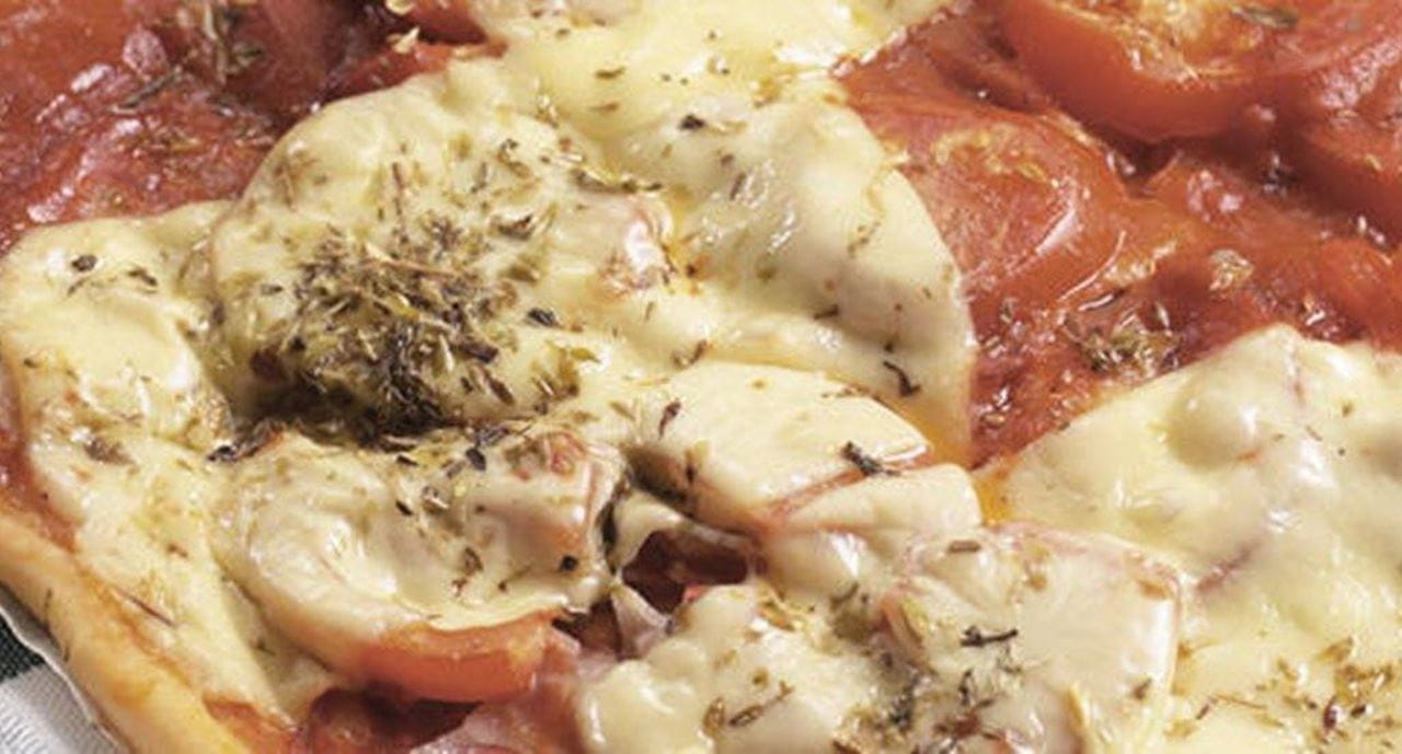- Cubra com as fatias de queijo mozzarella, polvilhe com os oregãos e regue com o azeite.