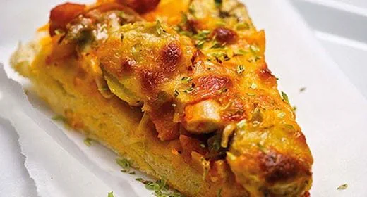 - Disponha, em camadas, sobre cada pizza o fiambre, o pimento, cortado em quadradinhos, os cogumelos escorridos, o milho e as bananas, em rodelas. Polvilhe com o queijo e orégãos e regue com um fio de óleo Vaqueiro.