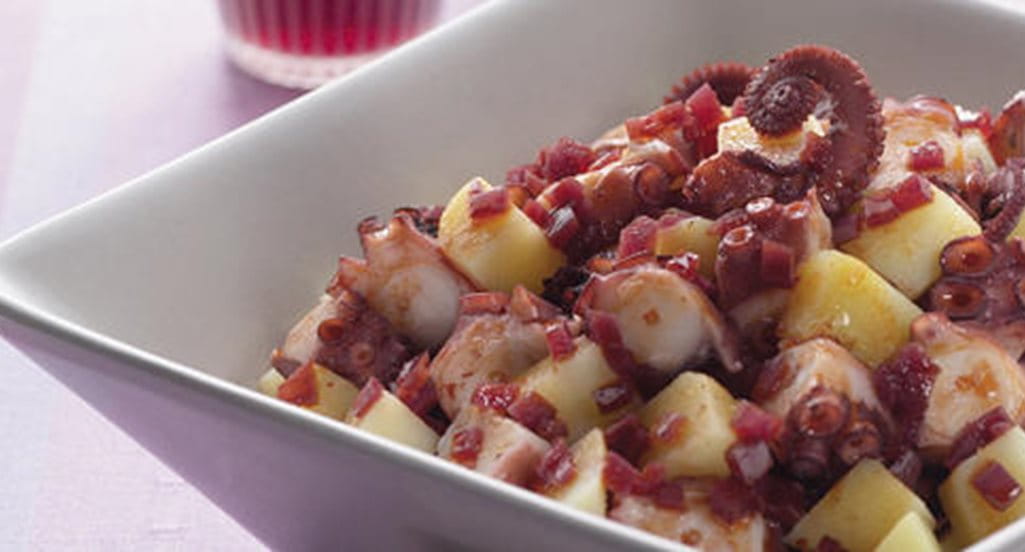 - Descasque e pique a cebola e leve ao lume com o azeite, o ramo de salsa atado, e a pimenta da terra. Quando a cebola estiver macia, junte o polvo, escorrido e cortado em bocados, e regue com o vinho tinto. Tempere com sal e deixe cozinhar sobre lume muito brando até o polvo estar bem macio. Entretanto lave as batatas e coza-as à parte em água temperada com sal. Depois de cozidas, escorra-as, corte-as em pedaços e junte-as ao polvo. Sirva imediatamente.
