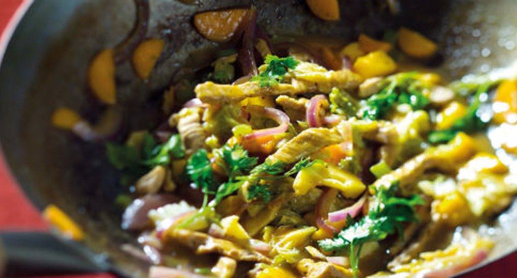 - Regue com o molho, deixe ferver um pouco até os legumes estarem tenros e junte os rebentos de bambu e os pedaços de manga.